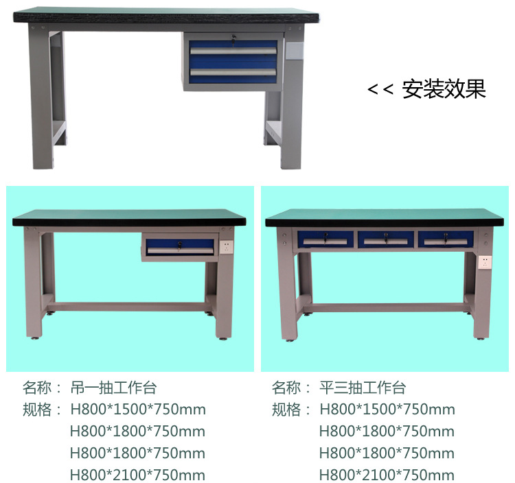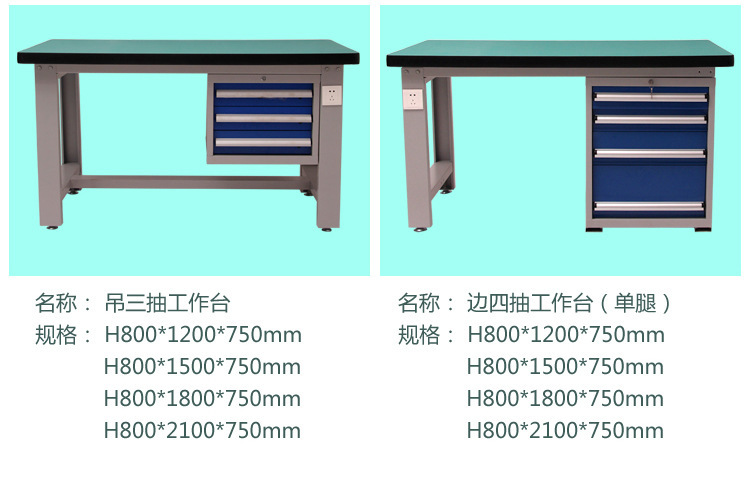 工作臺采用優質冷扎板精工制作而成,堅固的工作桌框架,牢固平穩,可使工作桌承重1000kg;多種工作桌面選擇,可配合不同使用的要求;工具吊柜(箱),側柜(箱)燈架,調節腳杯,,外形美觀;層板,抽屜質量上乘,承重大,抽屜內可根據需要任意分隔;節約空間,適用性強。