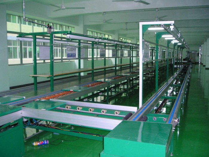 流水線又稱為裝配線,一種工業上的生產方式,指每一個生產單位只專注處理某一個片段的工作,以提高工作效率及產量;按照流水線的輸送方式大體可以分為:皮帶流水裝配線、板鏈線、倍速鏈、插件線、網帶線、懸掛線及滾筒流水線這七類流水線。一般包括牽引件、承載構件、驅動裝置、漲緊裝置、改向裝置和支承件等組成。流水線可擴展性高,可按需求設計輸送量,輸送速度,裝配工位,輔助部件(包括快速接頭、風扇,電燈,插座,工藝看板,置物臺,24V電源,風批等,因此廣受企業歡迎;流水線是人和機器的有效組合,最充分體現設備的靈活性,它將輸送系統、隨行夾具和在線專機、檢測設備有機的組合,以滿足多品種產品的輸送要求。輸送線的傳輸方式有同步傳輸的/(強制式),也可以是非同步傳輸/(柔性式),根據配置的選擇,可以實現裝配和輸送的要求。輸送線在企業的批量生產中不可或缺。