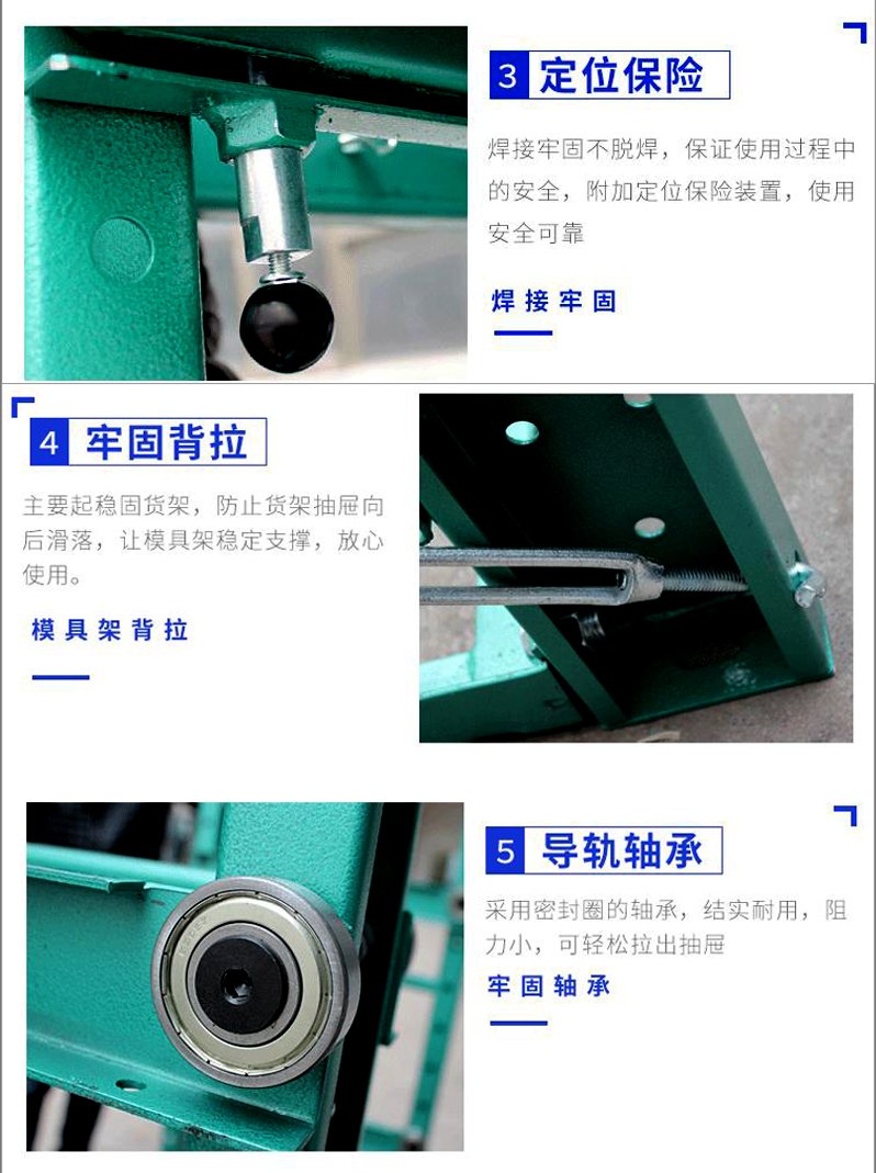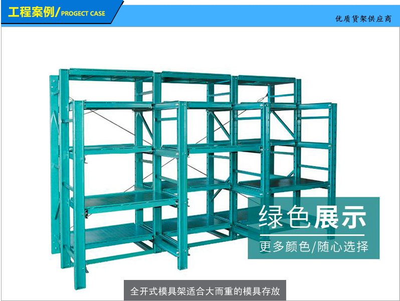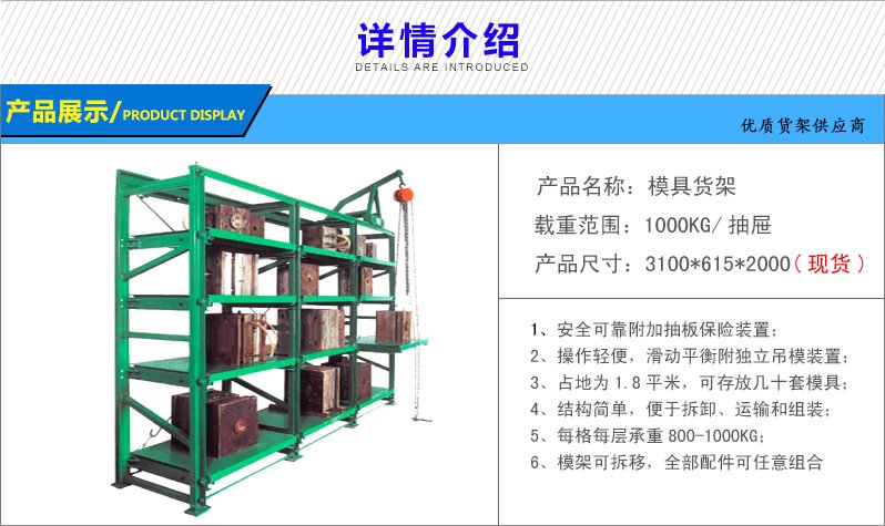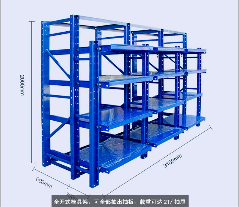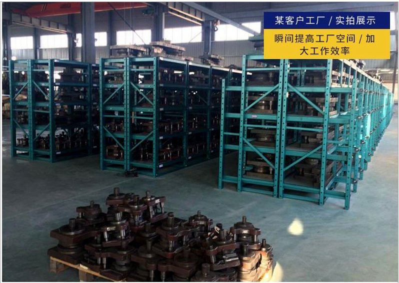 模具貨架適合于存放模具等機(jī)械加工塊的存放。占地少、承重大、分類詳細(xì)、存取方便。抽屜式滑道,可以80%抽出,操作簡(jiǎn)易,安全,是現(xiàn)代化工廠的維修及加工車間的工位器具。